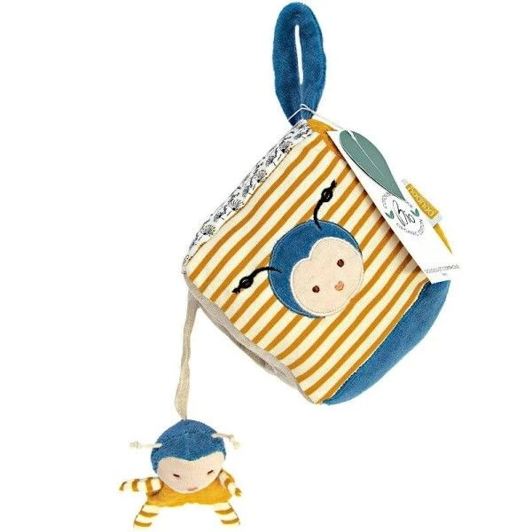 Composé de 6 faces différentes pour stimuler naturellement et simultanément l’ensemble des sens: jeux de couleurs et d’imprimés pour développer la vue, textures variées pour le toucher, hochet pour éveiller l’ouïe. L’enfant stimulera aussi sa curiosité et son imagination en jouant avec le petit doudou abeille relié au cube, qui se loge dans son orifice comme une abeille entre dans sa ruche. Facile à manipuler, ce jouet sensoriel, permet de développer la préhension, il est aussi très facile à attraper avec sa petite poignée. Un cadeau de naissance idéal!