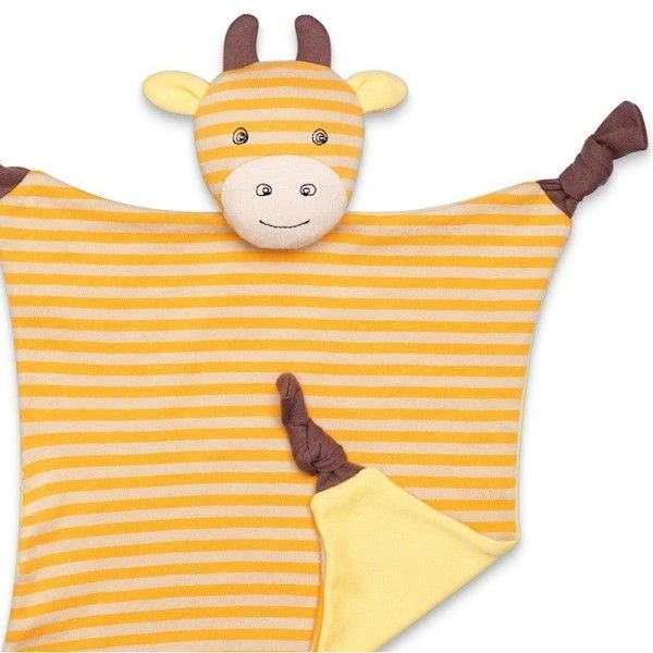 Pour les bébés bio, et dès la naissance, Eveil Physique, Jeux & réconfort avec ce doudou plat à Nœuds, Doudou Plat à Nœuds Girafe George 30 cm Coton Bio Organic Farm Buddies™. Une doudou plat carré à nœuds de 30 cm de côté, en jersey de coton bio rayé beige et orangé pour le corps pour ensoleiller les siestes de bébé. Et bien sûr la sympathique bouille souriante de notre ami(e) girafe est là pour rassurer bébé,… Avec ses longues pattes à nœuds pour la saisir, ses grandes oreilles à secrets, notre Girafe fera craquer plus d’un bébé. Avec ce doudou Organic Farm Buddies™ de la marque Californienne Farm Buddies™, Bébé pourra se dégourdir les doigts, mâchouiller, découvrir les couleurs, les formes, et les câlins. La tête de la peluche contient comme les hochets et le doudou plat carré assorti… un petit grelot discret.
