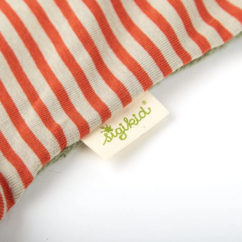 Pour les petits bébés écolo, et dès la naissance, Eveil, confort & réconfort en compagnie de ce joli Doudou plat à nœuds (mouchoir) Lapin Bio série Green Sigikid® 28 cm. Un joli doudou plat à nœuds de forme carré avec quatre beaux nœuds aux couleurs vert sapin et aux motifs géométriques blanc beige. Un doudou plat Lapin avec de longues oreilles pour l’attraper, un petit bandeau jaune pour le voir de loin, et une face en jersey rayé ocre et taupe. Un doudou lapin sympathique pour tenir compagnie à bébé. Avec ses petits yeux noire brodés, son corps en coton tout doux… ses oreilles à secrets pour mieux le tenir et le mâchouiller tendrement, ce doudou lapin ne quittera plus bébé. Protecteur de la nature et défenseur du développement durable, bébé le revendique avec ce joli doudou lapin beau et bio, amusant, protecteur, Chic & écolo. Le tissu coton à la texture douce de notre doudou plat lapin, offrent des sensations tactiles et visuelles inoubliables. En compagnie de ce doudou en coton, bébé est prêt à affronter le monde, en douceur, en couleur et en sécurité: Le doudou est en coton et rembourré en laine vierge.