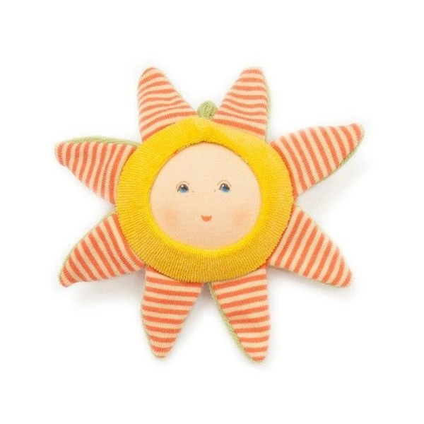 Pour les petits bébés écolo, et dès la naissance, Eveil, douceur & réconfort en compagnie de ce Hochet Fleur ‘Hochet Fleur de Soleil Rayée Nanchen® Natur Coton Bio Éponge & Jersey (Kba) couleur Jaune, Orangé et Vert. Un Hochet bio pour ‘bébé bio premier age’ en tissu éponge de coton bio et Jersey issu de l’agriculture biologique (certification Kba), rembourré à partir de laine bio de mouton (certification Kbt). Un Hochet bio en forme de fleur très colorée, avec différentes textures de tissus pour éveiller les sens de bébé,… chaque pétale est une invitation à mordiller, à se dégourdir les doigts, un peu d’exercice fera tintinnabuler le grelots sous la bienveillance de cette jolie fleur, dont le visage doux a les traits d’expression peint à la main, lui conférant cette identité unique. Facile à saisir, à câliner et à mâchouiller, grâce à ses petits pétales , notre Hochet Bio saura divertir et éveiller bébé, et lui apporter douceur et réconfort.